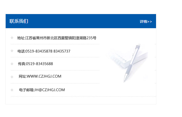 地址:常州市新北區友邦商務大廈1幢16、17層  電話:0519-85101652  傳真:0519-85112595  郵編:213022  網址:www_cz-jiayue_cn.wxguohubxg.com  郵箱:xiajifengaa@163.com